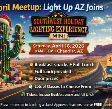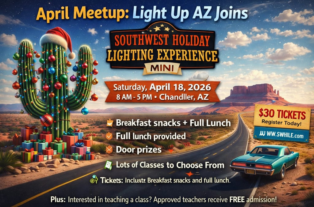Our April 18th meetup won’t be a typical monthly gathering — instead, Light Up AZ will be part of the Southwest Holiday Lighting Experience Mini in Chandler, AZ!